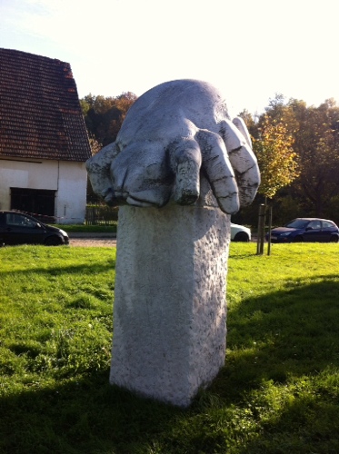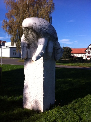 I really had no clue what to expect on this adventure. I knew there exists a statue of a cheese mite in Würchwitz, but I wasn’t sure where. Two friends in Leipzig decided to accompany me, and I was slightly worried the entire endeavor was going to end in disappointment. But it all turned out better than I could have imagined. First of all, it is impossible to miss the cheese mite statue, in all its marble glory, carved by local masons, when you drive into Würchwitz.