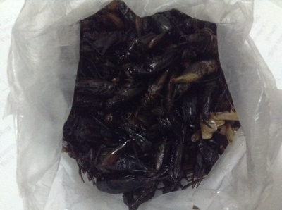 I’ve been keeping an eye out for insect snacks (protein, you know), and finally found some at the night market by the river in Battambang. A lady had three trays set up – peanuts, slices of fruit with chili salt, and a pile of fried crickets. I walked around for a couple of blocks while trying to screw up the resolve to go back and buy a bag. I finally made my way back, took some photos, ate a sample, which is easy when everyone is watching, and splurged one dollar on a bag. I guess the bags only come in one size, or else my sign language indicating that I wished a smaller bag failed. Realistically, I wanted something in the neighborhood of, say, five crickets. The scoop was a tin can, sort of canned vegetables–sized, which was filled to overflowing and dumped in a plastic bag. Wanting to take a photo, I headed back to my hotel, where, not surprisingly, my bag of snacks started looking far less appetizing than they did on the street. I managed a few more, but that was it.