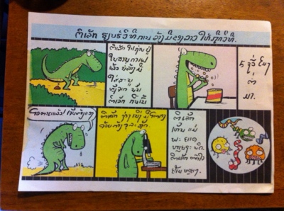 Dealing with gurgly bowels for 12 to 48 hours is annoying and unpleasant, but most travelers recover with no serious consequences, other than perhaps a lingering exhaustion. It could be that some can’t handle the Inferno Grade spiciness of the food – as I write this, a girl in my hostel dorm is telling her mother that she’s having stomach problems, possibly due to the spicy food – but it really mostly comes down to abysmal standards of hygiene and sanitation. It’s an interesting tangle of issues here that involves access, or lack of access, to clean water, disposal of all the plastic bottles that is the main source of most potable water, and a lack of basic understanding in some areas about the simple importance of personal hygiene and washing one’s hands. Or in some cases, there are no proper facilities in which to wash one’s hands. It all seems so backwards to those of us coming from developed nations, but it’s a dirty reality for a large part of the Lao population. I was trying to write something a little more comprehensive about this, but it started turning into a time-sucking rambling dissertation based largely on observation rather than fact, so I’m abandoning that effort in favor of posting this pic of a cartoon I found in Jhai Coffee House in Paksong. They run projects to install wells and water filtration systems in villages and schools, and to educate the kids on the importance of proper hygiene.